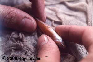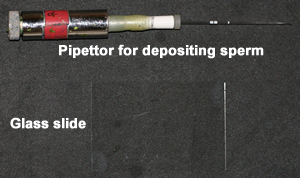 In my original procedure, I used drawn out Pasteur pipettes to collect and deposit the sperm. I still use a pipet to collect the sperm, but I now deposit the sperm with a manual pipettor. The images shown here were taken in the early 1970's. Please forgive the quality of the images and my dirty fingernails.