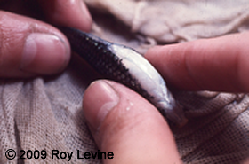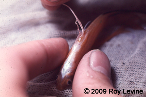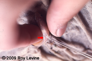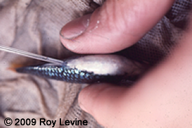 Active sperm is injected into the females urogenital opening located between the anal fin and the anal opening. It is difficult to see here, but the solution in the pipet is not cloudy as it should be.
